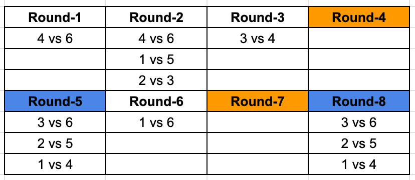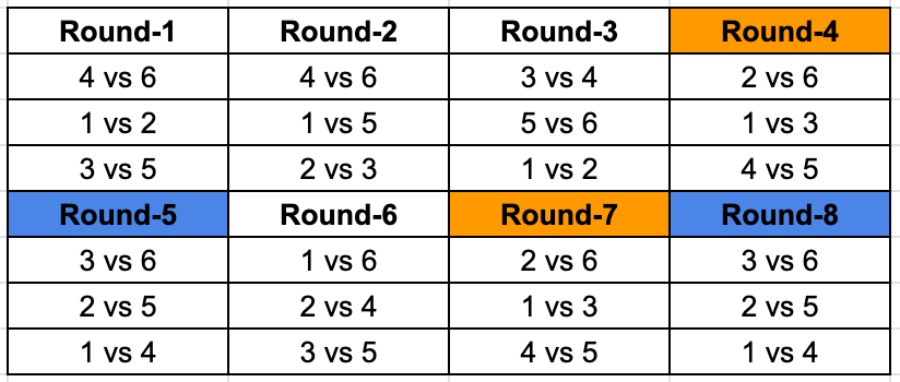 Rounds marked with the same colour represent the fact that the matchups are identical. Now we know that each team plays a game in each round, we know 2 out of the 3 matches for Round 2 and 8, and we can identify the third matchups as well. Giving us this resulting table.