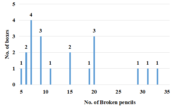 Following is the frequency table of the number of broken pencils for the twenty boxes: