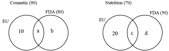 A speciality supermarket sells 320 products. Each of these products was either a cosmetic product or a nutrition product. Each of these products was also either a foreign product or a domestic product. Each of these products had at least one of the two approvals – FDA or EU.