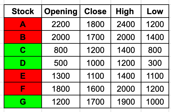 The chart below shows the price data for seven shares - A, B, C, D, E, F, and G as a candlestick plot for a particular day. The vertical axis shows the price of the share in rupees. A share whose closing price (price at the end of the day) is more than its opening price (price at the start of the day) is called a bullish share; otherwise, it is called a bearish share. All bullish and bearish shares are shown in green and red colour respectively.