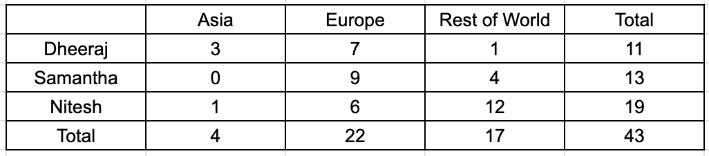 We can see that Dheeraj visited only 1 country in ROW so every other value in that column has to be zero for wherever Dinesh is present. And Samantha has not visited any country in Asia so every value with Samantha present in Asia should be zero as well.