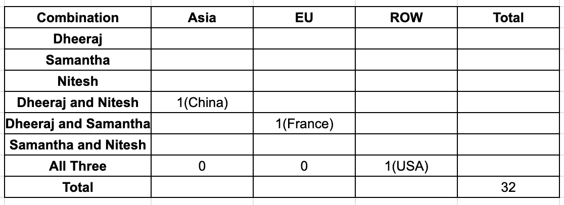 We have the following distribution, we are looking for 9 countries visited by exactly 2 people. And we have identified 2 countries, that means, 7 were countries were visited by both Samantha and Nitesh only. And given that half the countries visited by both of them are in Europe, and total number of countries visited by both of them is 7(only two of them)+1(USA)=8, they visited 4 countries in Europe together and 3 countries in ROW together. And using that information, we can fill in the rest of the table as well. Since we know the number of countries visited by each of them in a particular continent.